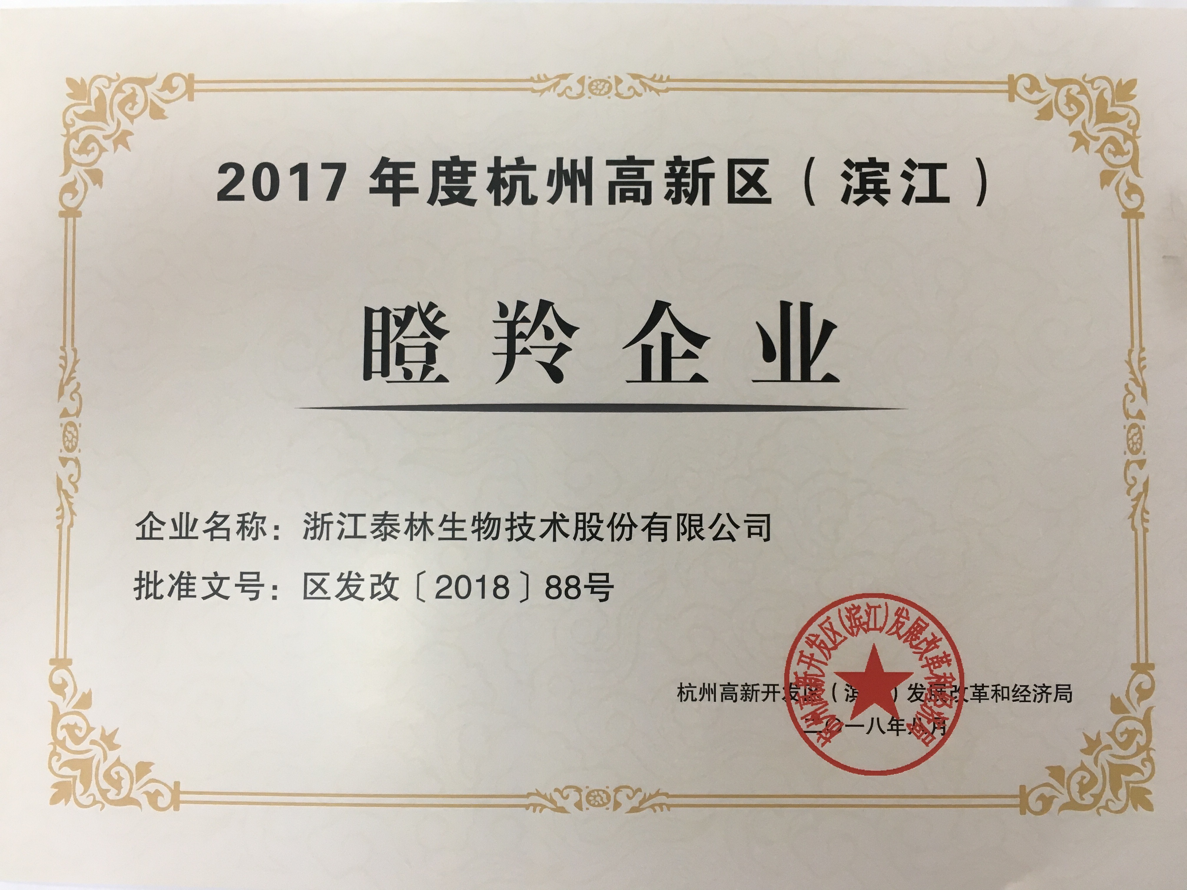 2018年8月下旬,2017年度高新區(qū)(濱江)瞪羚企業(yè)名單公布,浙江泰林生物技術(shù)股份有限公司榜上有名,標志著泰林生物連續(xù)3年獲評高新區(qū)(濱江)瞪羚企業(yè)稱號。